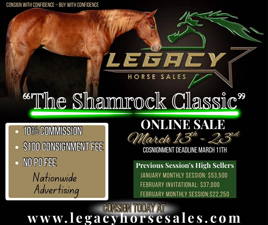 Featured “𝐓𝐡𝐞 𝐒𝐡𝐚𝐦𝐫𝐨𝐜𝐤 𝐂𝐥𝐚𝐬𝐬𝐢𝐜” ☘️ 𝖮𝗇𝗅𝗂𝗇𝖾 𝖲𝖺𝗅𝖾 View Details Consign Your Horse Today Consignment FormWe consign quality horses of all types. Go to consignment form Upcoming Auctions View All Auctions Mon2MarTimed Auction“𝐓𝐡𝐞 𝐒𝐡𝐚𝐦𝐫𝐨𝐜𝐤 𝐂𝐥𝐚𝐬𝐬𝐢𝐜” ☘️ 𝖮𝗇𝗅𝗂𝗇𝖾 𝖲𝖺𝗅𝖾VIEW DETAILS →Featured Lots View All MC Spoonful A QuixoteView Details Sun Of A ChipView Details ScooterView Details Online Horse Sale Every Month!! Check it out at Bid.legacyhorsesales.com We are an online auction style platform where we connect equine enthusiasts all over the world. Legacy Horse Sales is the place where you will find your next equine partner. About Us Contact Us Would you like to consign your horse to one of our auctions? If you have a horse for sale and would like to consign it to one of our upcoming auctions. Please complete the form. Thank you Consign Your Horse Today Bid from Anywhere. Manage your bids from the convenience of your phone and never miss an auction. Download for iOS Download for Android