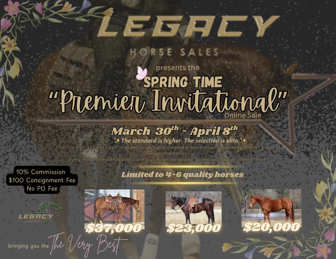 Featured “𝑺𝒑𝒓𝒊𝒏𝒈 𝑷𝒓𝒆𝒎𝒊𝒆𝒓 𝑰𝒏𝒗𝒊𝒕𝒂𝒕𝒊𝒐𝒏𝒂𝒍" 𝖮𝗇𝗅𝗂𝗇𝖾 𝖲𝖺𝗅𝖾 View Details Consign Your Horse Today Consignment FormWe consign quality horses of all types. Go to consignment form Upcoming Auctions View All Auctions Mon30MarTimed Auction“𝑺𝒑𝒓𝒊𝒏𝒈 𝑷𝒓𝒆𝒎𝒊𝒆𝒓 𝑰𝒏𝒗𝒊𝒕𝒂𝒕𝒊𝒐𝒏𝒂𝒍” 𝖮𝗇𝗅𝗂𝗇𝖾 𝖲𝖺𝗅𝖾VIEW DETAILS →Featured Lots View All Tru Catz GarfieldView Details CupidView Details Bravo Rosies AceView Details Online Horse Sale Every Month!! Check it out at Bid.legacyhorsesales.com We are an online auction style platform where we connect equine enthusiasts all over the world. Legacy Horse Sales is the place where you will find your next equine partner. About Us Contact Us Would you like to consign your horse to one of our auctions? If you have a horse for sale and would like to consign it to one of our upcoming auctions. Please complete the form. Thank you Consign Your Horse Today Bid from Anywhere. Manage your bids from the convenience of your phone and never miss an auction. Download for iOS Download for Android