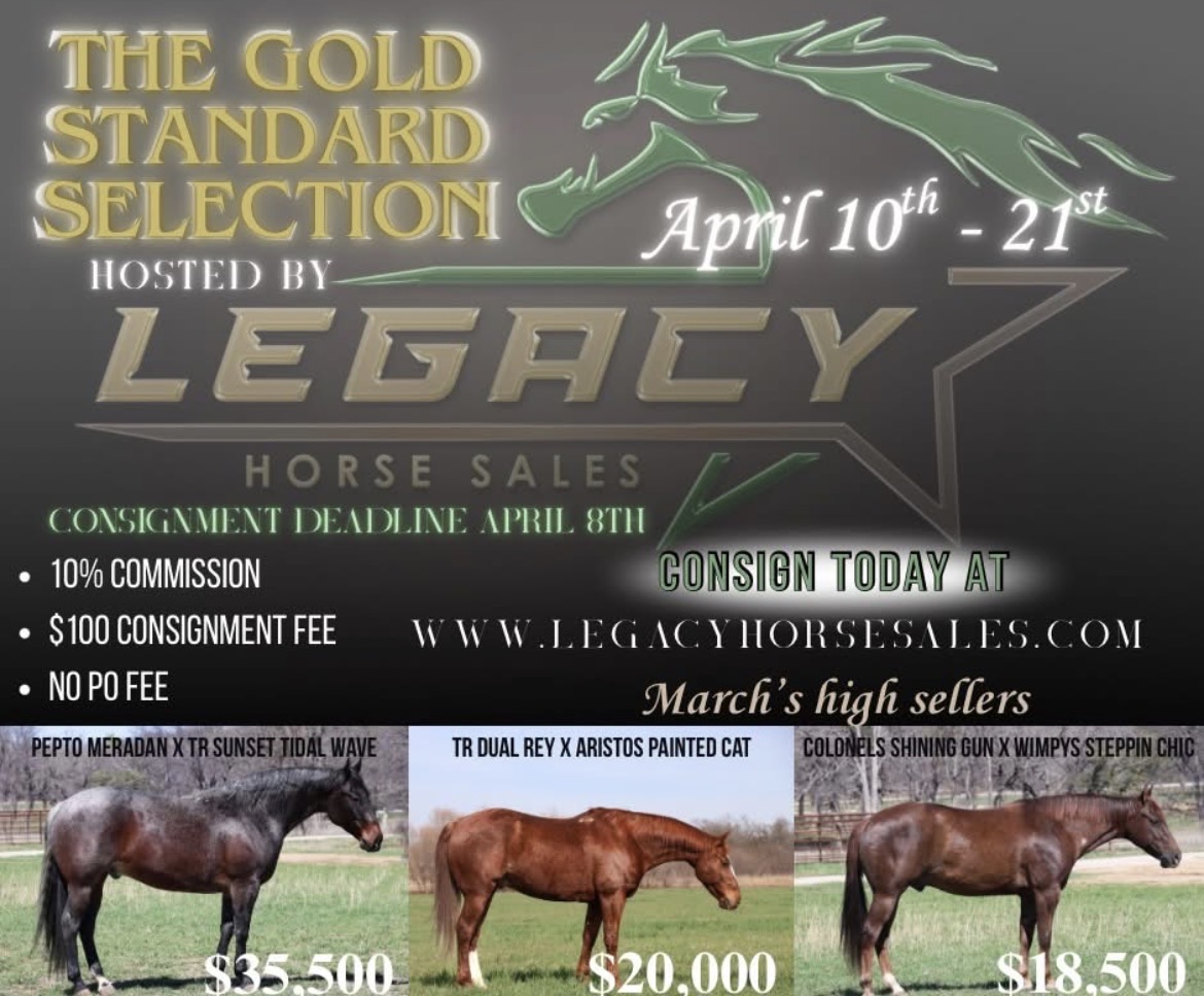 Featured βππ‘π ππ¨π₯π ππππ§πππ«π πππ₯ππππ’π¨π§β βοΈ View Details Consign Your Horse Today Consignment FormWe consign quality horses of all types. Go to consignment form Upcoming Auctions View All Auctions Wed8AprTimed Auctionβππ‘π ππ¨π₯π ππππ§πππ«π πππ₯ππππ’π¨π§β βοΈVIEW DETAILS →Featured Lots View All RSR DRIFTING COWBOYView Details DOCS DARK COMMANDERView Details BOONEView Details Online Horse Sale Every Month!! Check it out at Bid.legacyhorsesales.com We are an online auction style platform where we connect equine enthusiasts all over the world. Legacy Horse Sales is the place where you will find your next equine partner. About Us Contact Us Would you like to consign your horse to one of our auctions? If you have a horse for sale and would like to consign it to one of our upcoming auctions. Please complete the form. Thank you Consign Your Horse Today Bid from Anywhere. Manage your bids from the convenience of your phone and never miss an auction. Download for iOS Download for Android