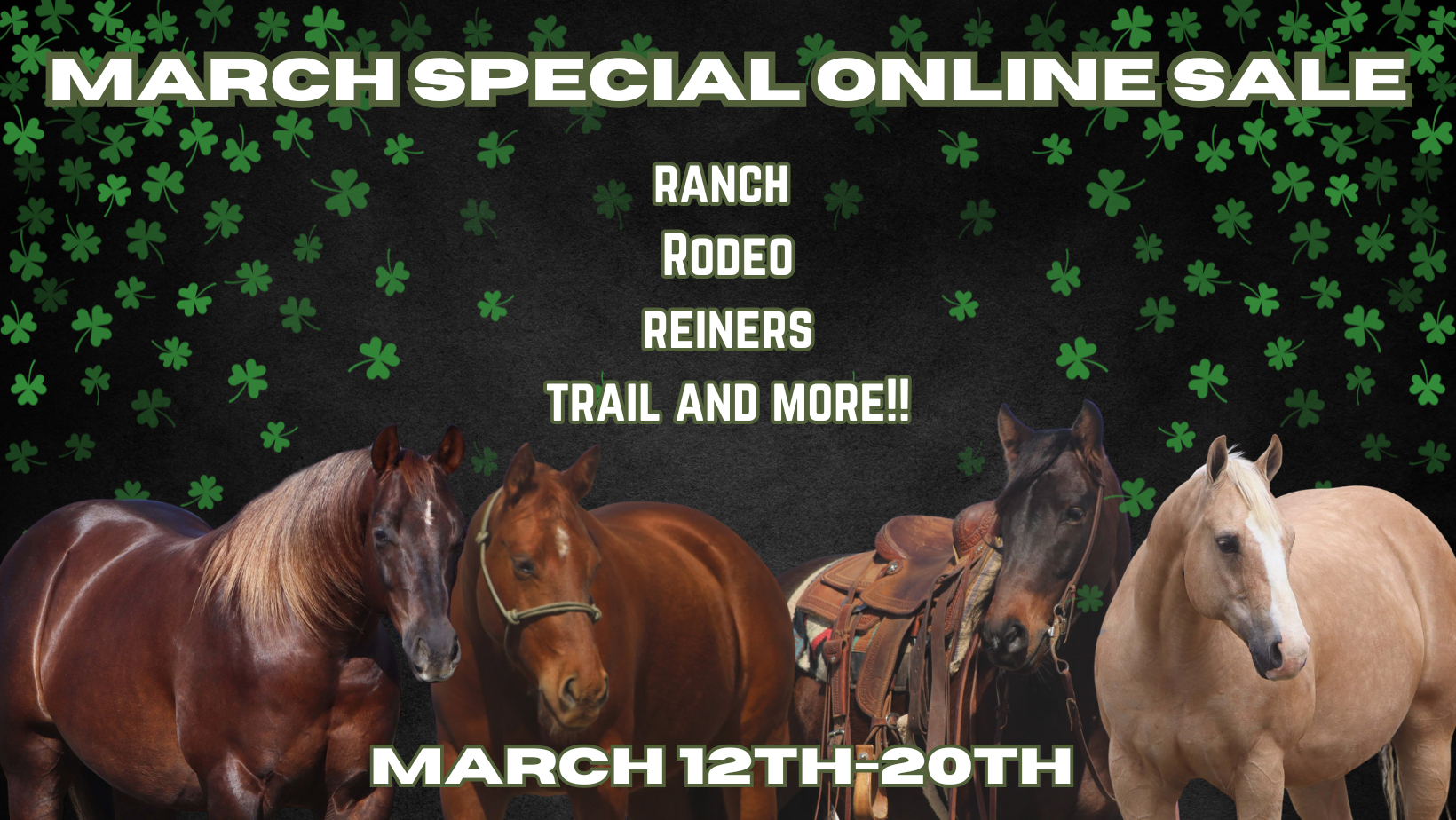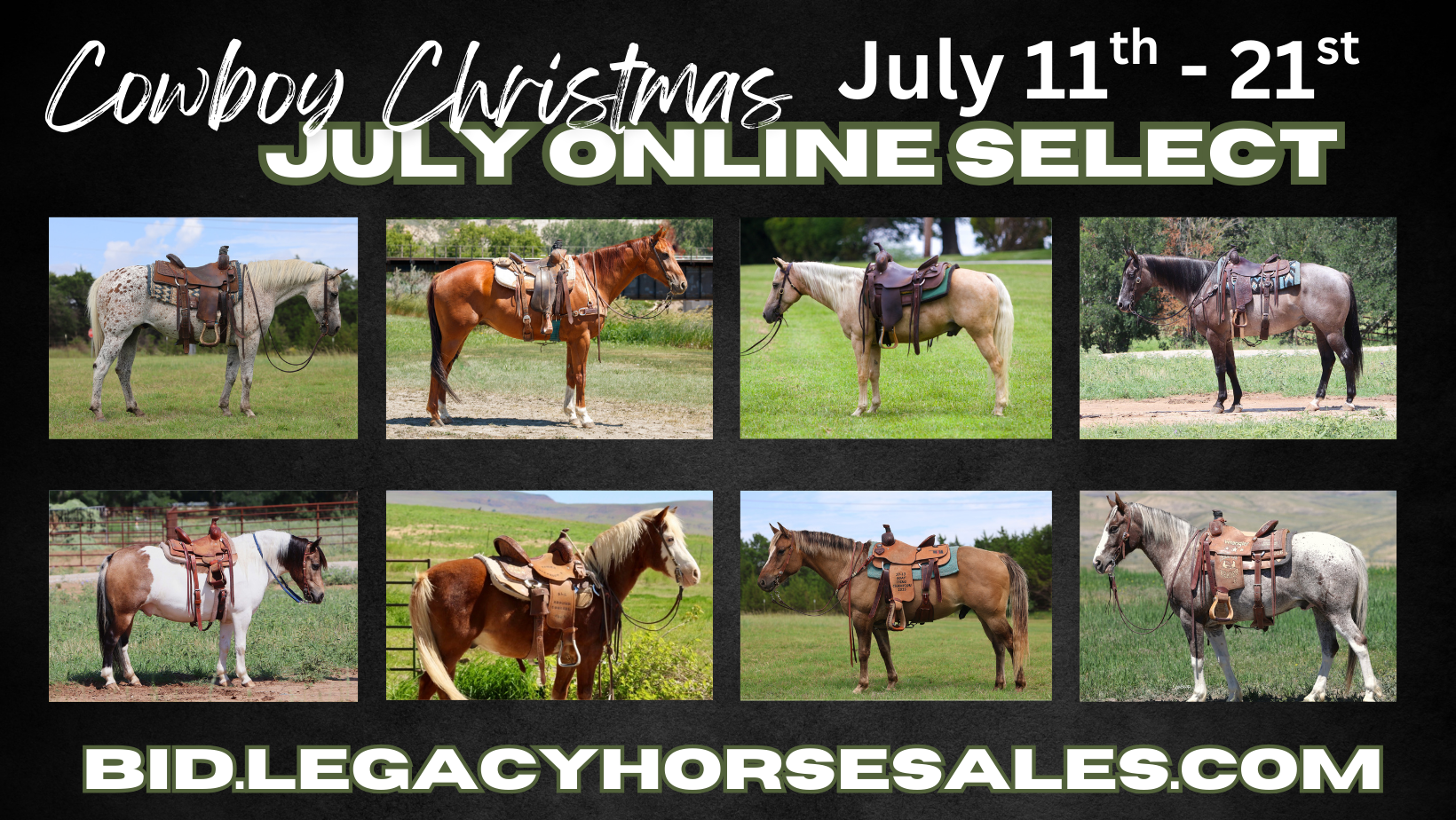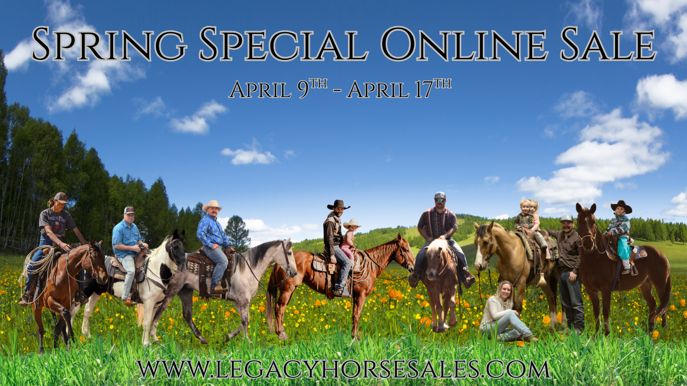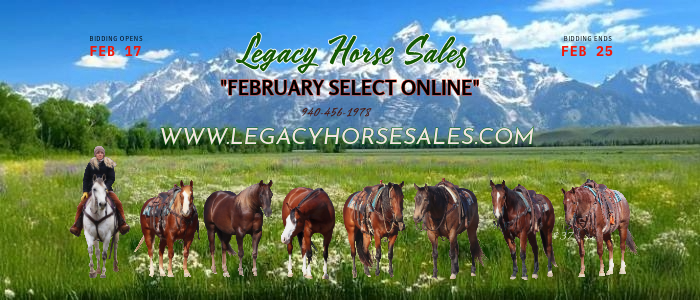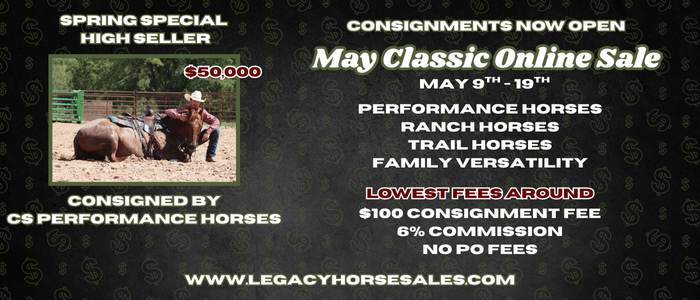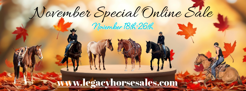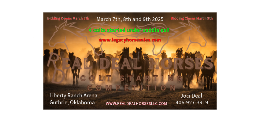 Timed AuctionFall Special Online SaleOct 10, 2025 View Results Timed AuctionTrailhead Classic Online SaleSep 12, 2025 View Results Timed Auction𝗦𝘂𝗺𝗺𝗲𝗿 𝗦𝗶𝘇𝘇𝗹𝗲𝗿 𝙾𝚗𝚕𝚒𝚗𝚎 𝚂𝚊𝚕𝚎Aug 8, 2025 View Results Timed Auction𝓒𝓸𝔀𝓫𝓸𝔂 𝓒𝓱𝓻𝓲𝓼𝓽𝓶𝓪𝓼 𝙹𝚞𝚕𝚢 𝙾𝚗𝚕𝚒𝚗𝚎 𝚂𝚎𝚕𝚎𝚌𝚝Jul 11, 2025 View Results Timed Auction𝓡𝓲𝓭𝓮𝓻’𝓼 𝓒𝓱𝓸𝓲𝓬𝓮 𝙹𝚞𝚗𝚎 𝙾𝚗𝚕𝚒𝚗𝚎 𝚂𝚎𝚕𝚎𝚌𝚝Jun 13, 2025 View Results Timed Auction𝓜𝓪𝔂 𝓒𝓵𝓪𝓼𝓼𝓲𝓬 𝓞𝓷𝓵𝓲𝓷𝓮 𝓢𝓪𝓵𝓮Apr 18, 2025 View Results Timed AuctionSpring Special Online SaleApr 9, 2025 View Results Timed AuctionMarch Special Online SaleMar 20, 2025 View Results Timed AuctionReal Deal Horses 3rd Annual Colt Starting CompetitionMar 7, 2025 View Results Timed AuctionTHE FEBRUARY SELECT ONLINEFeb 17, 2025 View Results Timed AuctionDecember Christmas Special Horse SaleDec 10, 2024 View Results Timed AuctionThe November Special Online SaleNov 14, 2024 View Results